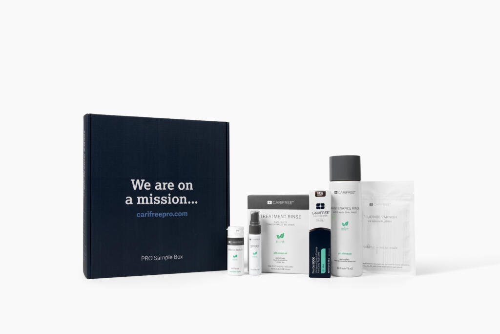 To receive free samples or learn more about CariFree and Caries Risk Management, please fill out the form. If you would like to do a 30-minute live webinar, a Customer Care Manager will contact you shortly to schedule. Samples include all full sizes of the following product: one tube of PRO Gel 5000, one bottle of Maintenance Rinse, a set of Treatment Rinse, an individual Spray, 3 sample packs of Breath Mints, and a copy of the Why Me book.